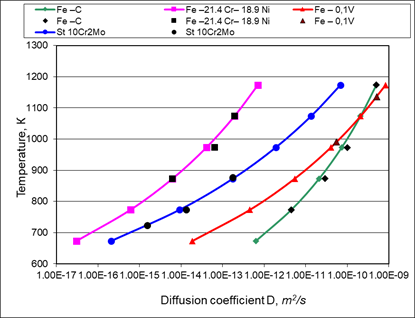 Separately, graphs were plotted for the diffusion coefficients of carbon in γ - phase of some steels (Figure 4).
