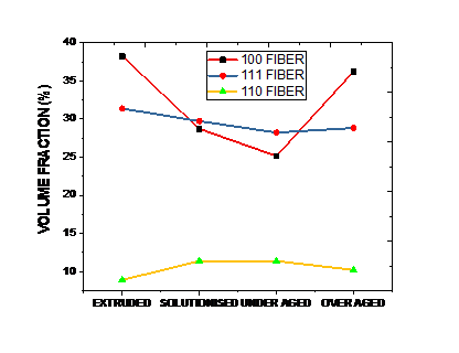 The volume fraction of various fibers observed in extruded, solutionised and aged samples has been listed in Table 2. The same has been calculated using the Resmat-Textool.