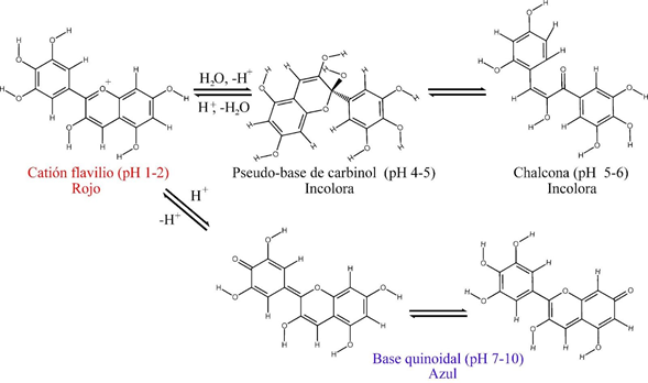 The pH plays a fundamental role in the structure of anthocyanins by promoting acid-basic, isomerization or addition reactions of a water molecule. For a pH less than 3, the main structure is the flavylium cation (HA+), which has a pKa from 4-5 for the formation of the conjugate base (quinoidal base). A nucleophilic addition at carbon 2 of H2O results in the formation of the colorless hemiacetal form, which upon an increase in pH leads to the formation of its colorless tautomer Chalcone (Figure 1).9,10 Apart from the importance in the pigment that it adopts when the pH varies, in its use as a natural colorant in food additives, in oenology11 or even as an intelligent indicator in the packaging of products to guess its freshness,12 also during digestion, the different pH levels in the body favor the most probable state of one structure or another.