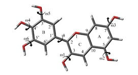 The optimized structure obtained in the gas phase for the cationic isomer (Flavylium cation) is completely flat (Figure 2). dihedral angles ω1 (C2-C3-O-H), ω4 (C3′-C4′-O-H), ω5 (C2′-C3′-O-H), y ω6 (C4′-C5′-O-H) are anti-peri-planar, maximizing the distance between the hydrogens with partial positive charge of the hydroxyl group, while ω2 (C5-C6-O-H) and ω3 (C6-C7-O-H) are syn-peri-planar, which is in agreement with the literature,14,15 only with the difference in the angle ω3, which in this case is sin-peri-planar that can suggest that the following structure is a local minimun not global.