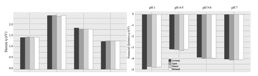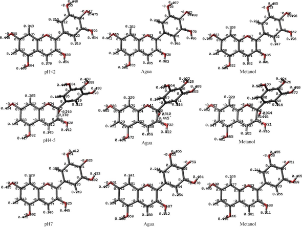 In Figure 5, the partial atomic charges calculated with CHELPG are shown, for the pure gaseous state of the solute and with the solvents water and methanol. In the pH<2 structure, it can be seen that the oxonium ion of the flavylium structure, O1 has a lower negative charge than the other oxygens, in gaseous form (-0.291), it does not reach a +1 charge on this atom due to the charges are distributed over all the atoms in the molecule.