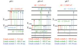 Figure 6 Excited states and electronic transitions of the predominant delphinidin molecule at 3 different pH levels.