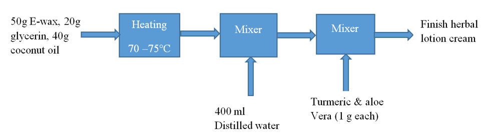 To avoid contamination, the workspace and all of the equipment were cleaned, and a scale was used to measure each ingredient precisely. 50 grams of coconut oil, 20 grams of glycerin oil and 40 grams of E-wax were melted together at a temperature of approximately 70 –75°C (158–167°F) for the oil phase making 110 grams. 400ml of distilled water was heated in a double boiler to the same temperature as the oil phase (70 –75°C) in a different beaker and pour in to the container that contain E-wax solution. Deep blender was used to blend the water and oil phases until they were homogenized. The mixture was thoroughly blended after adding aloe vera gel and turmeric extract. Heat Preservatives and fragrance were then added, and the mixture was blended once more to guarantee even distribution. F1 was ordinary lotion cream without turmeric and aloe vera, F2 is a blend of 75 % turmeric and 25% aloe vera and F3 is a blend of 75 % aloe vera and 25% turmeric respectively. The mixture was allowed to cool below 40°C (104°F), finished cream was then transferred into sanitized labelled containers and then kept for analysis (Figure 1).