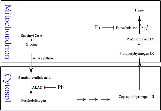 Figure 1 Inhibition of ferrochelatase and δ-aminolevulinic acid dehydratase (ALAD) in heme biosynthesis by Pb.12 ALA, δ-aminolevulinic acid