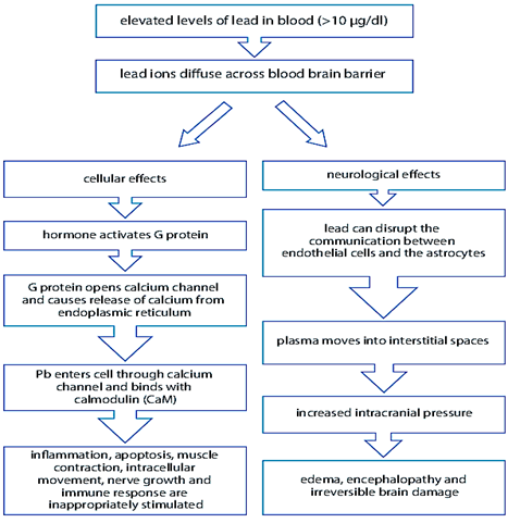 The activities of the central nervous system (CNS) are obstructed through the alteration of intracellular second messenger systems following human exposure to Pb.32 The mechanism through which Pb induces carcinogenesis encompasses the destruction of DNA, alterations in the DNA repair system and cellular tumor regulatory genes by ROS production. The ROS generated play a major role in the alteration of the structure and sequence of human chromosomes. Pb obstructs the process of transcription by displacing Zn in some regulatory proteins.15 According to Martin and Griswold,33 acute Pb toxicity initiates hallucinations, pain in the abdomen, headache, lethargy, loss of appetite, kidney function impairment, dizziness and arthritis. Conversely, chronic Pb toxicity leads to birth disorders, renal failure, neurological impairments, allergies, mental disorders, learning disability, and autism, muscles weakness, coma and possibly death. The process that leads to assorted diseases in humans due to high level of Pb in the blood is presented in Figure 2.