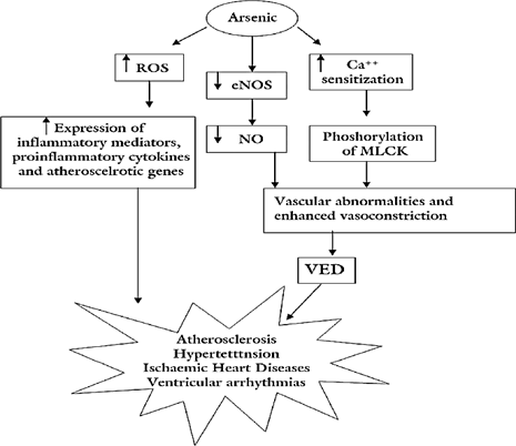 Continuous human exposure to inorganic As is accompanied by cardiovascular impairments such as atherosclerosis, ischemic heart diseases, ventricular arrhythmias and hypertension.47 As activates NADPH oxidase in the plasma membrane of vascular endothelial cells and vascular smooth muscle cells (VSMC) to trigger the formation of ROS e.g. H2O2 and superoxide ion (O-•2).48 The ROS formed in conjunction with nitric oxide (NO) generates strong oxidant known as peroxynitrite which is involved in the upregulation of inflammatory mediators e.g. cyclooxygenase-2 (COX-2).49 This ROS also elevates atherosclerosis related genes expression such as monocyte chemo-attractant protein (MCP-1), interleukin-6 (IL-6), and heme oxygenase-1 (HO-1), and thereby triggers the adhesion, penetration and movement of monocytes in the VSMC.50 As causes the transformation of the focal adhesion proteins in VSMCs resulting in their proliferation and migration.51 Also, As is known to trigger atherosclerosis pathogenic events by stimulating the generation of inflammatory mediators, nuclear factor kappa B (NF-ΚB) and tumor necrosis factor-alpha (TNF-α).52,53 Chen et al.,54 reported that As initiates neurogenic inflammation of the blood vessel by elevating the generation rate of endothelial neurokinin-1 and substance P. Additionally, reports showed that As aggravates the function of endothelial nitric oxide synthase (eNOS) as well as Akt/protein kinase B, which in turn reduces NO concentration, which results in vascular endothelial dysfunction and related cardiovascular impairments.55,56 As induces vasoconstriction of the blood vessels through phosphorylation of myosin light chain kinase (MLCK), and enhance calcium sensitization, and thereby cause hypertension.57 Chronic As toxicity stimulates oxidative stress as well as initiates changes in the production of vasoactive mediators in the blood vessel that provokes hypertension.58 Ventricular arrhythmia has been attributed to arsenic trioxide toxicity through the induction of elongated Q-T interval and action potential duration.47,59 Generally, As initiates cardiovascular dysfunction through the stimulation of high oxidative stress, hindered eNOS stimulation, and activation of MLCK phosphorylation60 (Figure 3).