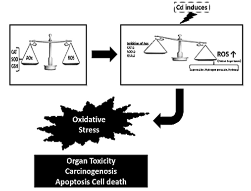 Figure 5 Effects of elevation in reactive oxygen species (ROS) and suppression of antioxidant levels induced by Cd.22