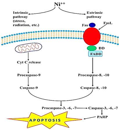 Ni is known to induce cell apoptosis. There are two major pathways through which cells undergo apoptotic death; they include the intrinsic (mitochondrial pathway) and the extrinsic pathways. The intrinsic pathway is initiated by intracellular signals when cells are stressed and are associated with the release of Cyt C from the intermembrane space of mitochondria. The extrinsic pathway is triggered by extracellular ligands bound to cell-surface death receptors (TNF, TNF-receptor family), which prompts the production of the death-inducing signaling complex. In the intrinsic pathway, the cell kills itself due to cell stress, while in the extrinsic pathway; the cell kills itself due to signals received from different cells. The two pathways initiate cell death by stimulating caspases (cysteine proteases) or protein degrading enzymes. Ni ions permit the release of Cyt C from the mitochondria into the cytosol, where Cyt C splits procaspase-9 followed by the activation of caspase-9, which induces caspase-3, -6, and -7. These caspases act on PARP, which instigates apoptosis. On the surface of the cell, the Ni ions supports the interaction between Fas (First apoptotic sign) and FasL (Fas Ligand) as well as the production of the death-inducing signaling complex, which is made up of FADD and procaspase-8 and -10 that are activated to caspase-8 and -10. In the cell, caspase-8 and -10 split and stimulate the effectors of proteases, namely, caspase-3, -6 and -7 which act on PARP, leading to apoptosis103,122 (Figure 6). Defective apoptotic processes are linked with several pathologies. For instance, rapid cell death is associated with various neurodegenerative diseases. However, the failure of apoptosis results in immune system diseases and uncontrolled cell proliferation, like cancer.103