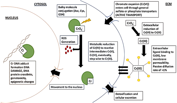 Cr has the potency to change the epigenetic profile of cells both at the DNA methylation level and the histone modification level.128-130 Human exposure to Cr (VI) changes the epigenetic landscape through interacting directly with chromatin and the enzymes that are involved in the modification of the DNA. Cr (VI) alters the activities of epigenetic machinery e.g. the histone deacetylase (HDAC) enzymes, and renders them inactive.131,132 Generally, human exposure to Cr (VI) initiates toxic and carcinogenic effects through a complex multi-front mechanism of action involving oxidative stress, epigenetic alterations, chromosome and DNA structural and functional impairments, as well as mutagenesis.133