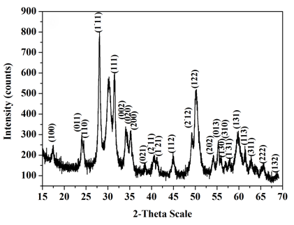 The phase purity and the crystal structure of as-prepared nanoparticles were identified by Powder X-ray diffractometer. Figure 1 represents the diffraction pattern for zirconia nanoparticles which is indexed as monoclinic ZrO2 (m-ZrO2) and are in good agreement with the standard JCPDS no. 83-0936. The diffraction pattern shows sharp and well defined peaks which indicate the highly crystalline nature as well as purity of the sample. Thus on the basis of X-ray diffraction studies, it has to be concluded that pure monophasic ZrO2 powder was prepared by using the prescribed method as discussed in experimental section.