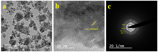 Figure 3 (a) Transmission electron micrograph, (b) HRTEM image and (c) SAED pattern of ZrO2 nanoparticles.