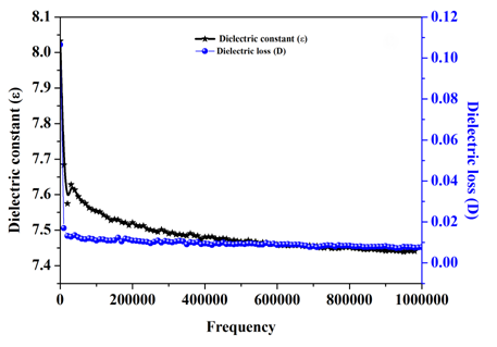 The dielectric properties of as synthesized nanoparticles were studied as a function of frequency after sintering the pellets at 1000 °C for 10 hours. The dielectric constant is estimated by using the formula.36