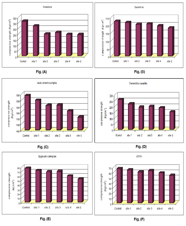 Figures 1A-1F show the average compressive strength of the chosen building units exposed at the various districts in Cairo after successive three years of exposure. The figures clearly indicate that the compressive strength for all the examined building materials were decreased at all the districts compared with the control one. This is mainly due to the external effects and internal weakness in building stones, due to the action of air pollutants, and the formation of imbrittlement crusts at the surfaces of stones. As it has been expected, the lowest deterioration, in turn of compressive strength were recorded for building samples exposed to the atmosphere of the pure residential area with low population and low human activities (site 1). This is not surprising, since from pollution results of this study, the atmosphere of site (1) have a relatively low pollution load compared to those of other districts of Cairo City (Table 1). On the other hand, the highest deterioration was recorded at site 5 (industrial area) for all the examined samples where high concentrations of gaseous and particulate pollutants are emitted due to the industrial activities.