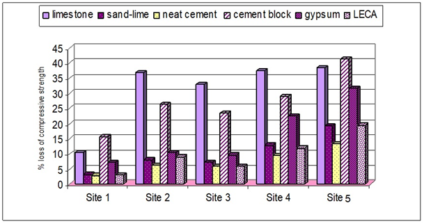Figure 2 The percentage loss of compressive strength for different building units at various investigated sites in Cairo City after three years of exposure.