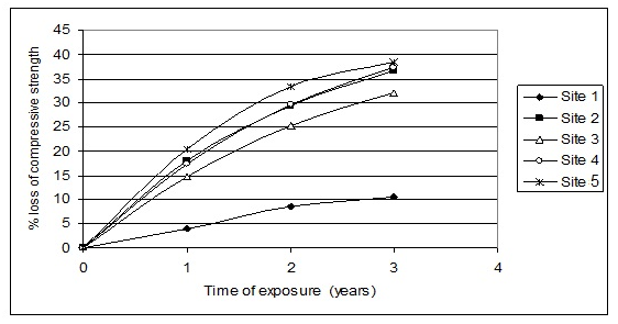 Figure 3 Loss of compressive strength of limestone samples exposure at various sites as a function of the time of exposure.