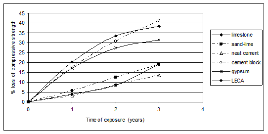 Figure 3 illustrates the percentage compressive strength losses of limestone samples exposed at the chosen sites as a function of exposure times. The figure shows that the percentage loss of strength was fast during the first year and tends to be less progressive through the second and third year at all the sites of measurement. This behavior clearly indicated at site 5 (industrial area). This can be attributed to the higher concentrations of air pollutants mainly SO2 and sulfates, which can readily react with limestone forming gypsum. Due to the lack of rain in Egypt, these layers of gypsum can accumulate on the surfaces of stones forming crusts, which hinder further fast reactions. The percentage strength losses of different samples as a function of the time of exposure at the industrial area (site 5) are given in Figure 4. Figure 4 shows that, the behavior of the strength losses for the different samples can be categorized into different groups. The first group includes limestone and gypsum, where the strength loss increased at a fast rate through the first year and the rate declined through the second and third years. The second group includes cement blocks, sand-lime and neat cement, where the compressive losses rose steadily with the time of exposure. The third group includes LECA samples, where the strength losses increased steadily through the first two years and fastly through the third year.
