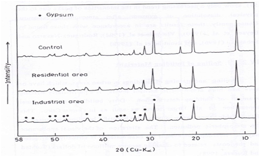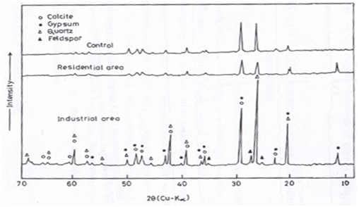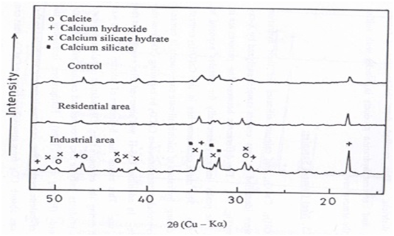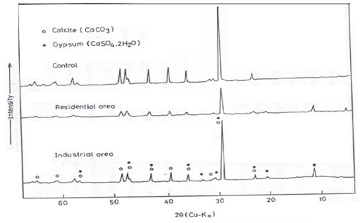 The product films constituents of the investigated building samples, exposed at residential and industrial districts for a period of three years, were examined by X–ray diffraction analysis and compared with the control samples. The product film of the top surface of each type of building samples were ground and packed in a plastic holder; no adhesive or binder was added. X-ray powder patterns were obtained at room temperature using a Philips diffractometer (Type pw 1399) employing Ni-filtered CuK α-radiation (λ=1.5404Å). The X-ray tube was operated at 36Kv and 25mA. The diffraction angle 2θ was scanned at a rate of 2 degrees. min-1.