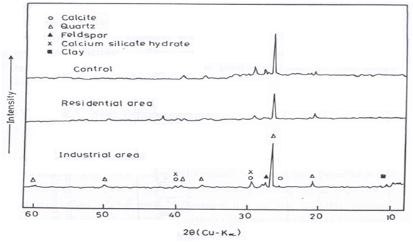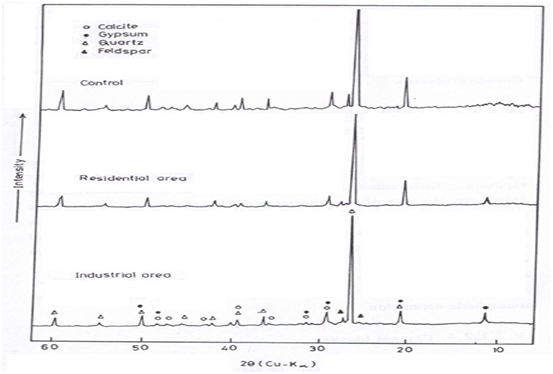 Feldspar (NaAlSi3O8), which is one of dust and ash constituent, was identified in samples exposed in the industrial area. Gypsum was identified at both residential and industrial districts which resulted from the reaction of calcite aggregates and cement hydration products in blocks with sulfur dioxide in the atmosphere.