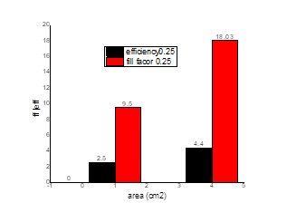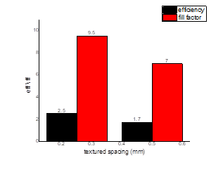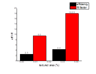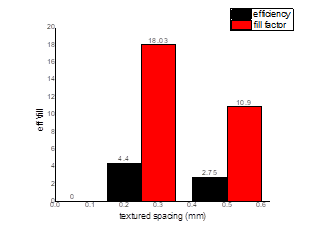 Figure 3 depicted the values of the efficiency and fill factor versus the textured area in two dimensions with 0.25 mm line spacing. Figure 4 depicted the increasing in the efficiency and fill factor versus the percentages textured area in two dimensions with 0.25 mm line spacing. The obtained results showed that the texturing of 0.0082% from the total surface area of the solar cell by 0.25 mm line spacing in two dimension results in increasing of 2.5% in its efficiency and 9.5 in its fill factor. While, the texturing of 0.032% from the total surface area of the solar cell by 0.25 mm line spacing in two dimension results in increasing of 4.4% in its efficiency and 18.03 in its fill factor.
