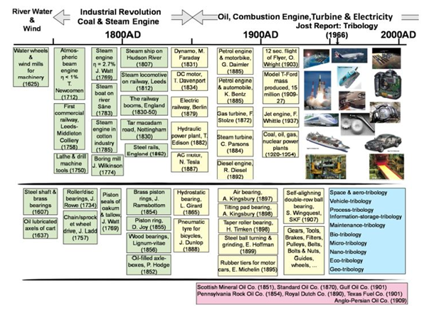 Necessary partner apparatus/gear and tribo-components are point by point sequentially arranged in Figure 1 where countless subtleties of names and years are from the book of "History of Tribology" are accommodated by D. Dowson (1979).6 From Figure 1 the advancement of tribological improvement in various instruments like smooth execution of steam motor, mechanical age of power, dependable execution of petroleum motors, turbines, fly motors with the created transmission frameworks in relationship with direction, pinion wheels and greases. For the present ventures and their items, bearings and pinion wheels greased up by oil are not all tribo-components but rather numerous others have been as of late planned like seals of gases and fluids, brakes and tires, electric wires and strips, attractive heads and tapes/plates, greaseless aides, oil-less dry metal cutting apparatuses, metal framing instruments, hip/knee joints and joints of robots in the space. The presentation of another word "Tribology" was opportune to portray the science and innovation for current businesses and the statements of "Space and aero-, Vehicle-, Process-, Information-stockpiling, Maintenance-, Bio-, Nano-, Eco, and Geo-tribology" have been presented over the most recent 50 years to describe the job of tribology in every trademark field of industry.1,2