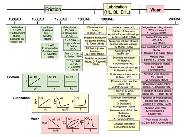 Figure 2 Empirical laws and theories of friction, lubrication and wear established in the past 550 years (F: friction force, W: load, v: velocity, Aa: apparent contact area, d: film thickness, η: viscosity, ω: angular velocity, p: contact pressure, T: temperature, Nf :fatigue limit cycle, ∆V: wear volume, L: sliding distance).