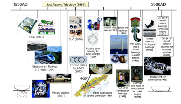 Figure 3 sequentially shows 14 types of current machines and tribo-components manufactured in Japan in the previous 50 years. They are presented from the 50th Anniversary Report of Japanese Society of Tribologists (2007).22 The head/circle drive framework has been created in the accompanying 50 years for the more modest size and enormous limit. The control of friction and wear has facilitated electric train 'Shinkan-sen' run at over 270km/hr. DLC surface treatment, ceramic bearing, oil-less tower connect bearing for non-CFC compressor were created in the timespan of 1970 to 1990. Thrust bearing made of plastic of PTFE/GF/MoS2, Lead free over lay in driving/crank shaft were being created and utilized in 1994-1999. The DN esteem arrived at 3×106 with hybrid ceramic orientation for a rocket motor in 2001 and 5×106 for a machine axle in 2004. These fruitful accomplishments in enterprises are made conceivable by the principal information on properties of friction and wear at the dry or greased up contact interface appeared in Figure 2.1