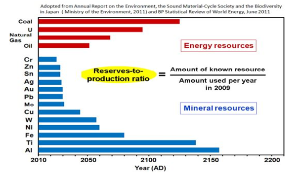 Figure 8 Resources reserves of energy and metals. (Ministry of the Environment, 2011) and (BP Statistical Review, 2011).
