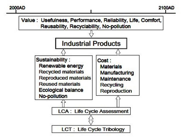 People are currently at happens of altering their lifestyle from existing ones of "Large scale manufacturing, Mass-utilization and Throw-away" to the new horizon of life of no organic sources of energy and food staffs, as demonstrated in Figure 8 & Figure 9. They also must be prepared for the unfavorable consequences for their wellbeing and prosperity by the accumulated tainting in air, mineral water and ground. Substance debased dinners and climatic change are outlines of the unfavorable impacts. Difficulties to make upsets in innovations of energy, materials and climate are obviously needed for tackling the issues and setting up new "Lifestyle of Health and Sustainability (LOHAS)" depicted by P. H. Ray and S. R. Anderson34 which would guarantee the never-ending presence of mankinds in cooperative associations with other living things.1 Figure 10 records the fundamental watchwords to portray those revolutions. "Energy revolution" will be made by changing wellsprings of energy from oil, gas, uranium and coal to reproducible energy like the sun, water, wind, ground heat and bio-mass. Table 3 records fundamental catchphrases identified with the items in 2000-2100. To plan items for the prerequisite, "Designing" of sustainable power, reusing, reuse and multiplication of materials, zero-emanation of contaminations and biological equilibrium should be developed. In deciding the expense of an item, expenses of reusing or potentially recreating materials should be thought of. LCA (Life Cycle Assessment) in 2000-2050 will basically manage the things in Figure 11 for supportability and cost, where tribology is required to make commitments from the perspective of LCT (Life Cycle Tribology) for the better score of LCA of an item (Kato and Ito, 2004, 2005).35
