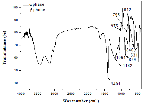 PVDF polymers have different crystalline forms, among them the alpha (α), beta (β), gamma (γ) and delta (δ) forms can be identified and even quantified by Fourier Transform by Infrared (FT-IR). Figure 2 shows the spectrum of the pure PVDF obtained by dissolving the PVDF powder in DMF, drying at 50 ºC for 6 hours. Figure 2 shows the absorption bands characteristic of the crystalline phase α at 1182, 975,795, 612 and cm-1 and the absorption attributed to the β phase at 1401, 1064, 879 and 840 cm-1. In the bands corresponding to the amorphous part of the PVDF (600 and 880 cm-1) small peaks are observed, since they are overlapped by the 612 cm-1 (α) and 879 cm-1(β) bands. The characteristic phase γ was not observed in the absorption region, however, the band observed at 840 cm-1 is common for both the β phase and the γ phase. The absorption attributed to the δ phase were not observed.19-23 To observe the relationship between formation of the β phase and the synthesis parameters, the intensity of peaks around 763 and 840 cm-1 of the FTIR spectra were used to evaluate the relative amount of β phase, according to the reference protocol.13 In Figure 3, the influence of drying time at constant temperature of 50ºC was clearly observed. The highest formation of the β phase was 86 % with drying time of 16 hours and the lower formation of the β phase was 70 % with the drying time of 23 hours. The drying of 6 hours and 10 hours remained as intermediates. So, 16 hours of drying time at 50ºC can be used as default for this system.