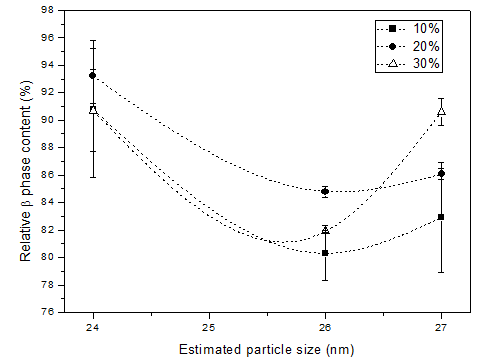 Regarding the percentage of β phase in nickel ferrite doped samples Figure 4 shows the amount of β phase as a function of estimated ferrite particle size for different weight % of nickel ferrite added in PVDF polymers. The higher amounts of β phase (higher than 90%) are observed for the smaller sizes of doping particles, regardless the amount of ferrite added. The amount of dopant added only have significant influences for higher particles sizes (higher than 27 nm). From microscope images of composites the two phases can e identified: nickel ferrite (darker phase) and PVDF (lighter phase), as shown in Figure 5 for the composite doped with 24nm NiFe2O4 particles. The images shown a small porosity of the films, in resulting in formation of magnetoelectric composites with higher interaction between polymer and nickel ferrite.15 Also is possible to see the formation of spherical particles of PVDF, as predictable.