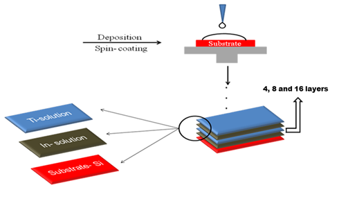 The substrates were spin-coated by dropping a small amount of the polymeric resin onto them. Rotation speed and spin time were fixed at 700 rpm for 3s and 7200 rpm for 30s, using a commercial spinner (Chemat Technology KW-4B spin-coater). After deposition, the wet films were dried at 80 °C for 10 min on hot plate. Four, eight and sixteen layers were deposited for each film and the procedure was repeated for each layer. The deposition of multilayer TiO2/In2O3 thin films (4, 8 and 16 layers) on substrates was illustrated in Figure 1. Finally, the films were heat-treated in the resistive furnace at 300, 500 and 700 °C for 2 h. Two films were produced for each temperature and for each variation of the number of layers, to be characterized.