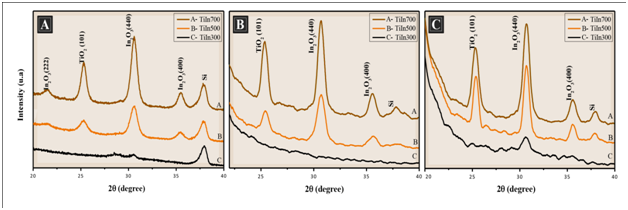 X-ray powder diffraction patterns of TiO2/In2O3 films obtained by the spin-coating method and calcined at different temperatures and different numbers of layers deposited, as shown in Figure 2A 4 layers, (Figure 2B) 8 layers and (Figure 2C) 16 layers. The XRD characteristic peaks of anatase and In2O3 are clearly observed. The TiO2 phase was indexed according to the PDF No. 73-1764. The anatase oxide structure was confirmed by the diffraction peak of 2θ = 25.3 °C.7,8 The In2O3 phase was indexed according to the PDF No. 6-416, of which one can identify a cubic structure. The In2O3 phase is confirmed by the diffraction peak of 2θ = 30.3 °C.9 According to Poznyak,10 thin films of TiO2/In2O3 prepared with different crystallization temperatures did not reveal any additional phases.10 This indicates that no chemical interaction occurs from the TiO2 with In2O3. It is also observed that the increased temperature favors the increase in the intensity of the lines both for anatase and In2O3, which can be seen in Figure.8