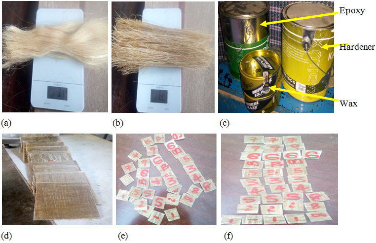 Firstly, the bamboo culms with around 180cm long are divided into four slabs by using a circular hack-saw machine. All slabs are banded and crushed by using circular banding and crushing machines respectively to remove liquid forms and the thinner layer exoderm from the inner bamboo Culm. Three weeks have been used to dry the crushed bamboo culms in the sun. Secondly, the dried bamboo strips are waiting in the water for twelve hours in order to make a soften slab. Then the bamboo strips are manually beaten many times at a slow uniform impact load using a rubber hammer in order to get single fiber. The resulting fiber bundle is combed using a steel wire comb. The process of beating and combing is repeated until individual fibers are separated. The strongest part of six years age of sisal plant leaf had cut out from the original sisal plant. Both ends of sisal plants have been trimmed to get the appropriate size. The surface of the sisal leave is scrapped by a sharp knife with the guidance of a wood table up to get the single fiber. The mixture of fibers and cellulose have been washed in pure water to identify the single fibers. Finally, the sisal fibers have been dried for 60 hours in the sun. The bamboo and sisal fibers have been treated in 5% and 8% concentration of NaOH for 4 and 8 hours respectively. Then, the fiber washed many times with fresh water in order to reduce reactivity with the environment. Finally, these fibers dried in sunlight for 48 hours.