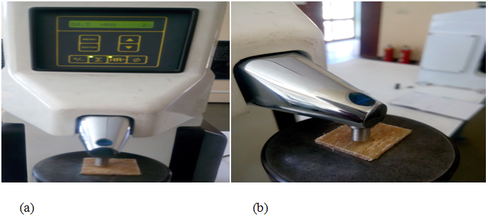 Hardness test: The hardness testing was performed on hybrid sisal/bamboo fibers reinforced epoxy composite in a laboratory experiment. In this section, the prepared specimen was involved in hardness testing using the Rockwell Hardness testing machine as per scale -A. The dimension of the specimen is (20x20x3)mm3 were prepared as per ASTM D 384. To obtain Hardness test results, the specimen is inserted into the test fixture which is placed between the bottom circular plates of the testing machine and upper 60kg loaded in according to scale –A. after 60kg load attained by hand control loading part, the hardiness values recorded on the dial. The hardness testing fixture is shown in Figure 3.