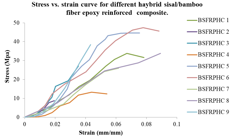The compressive strength has been evaluated for nine different types of hybrid sisal bamboo fibers reinforced epoxy composite. For each composite, five similar specimens are prepared and tested. Figure 4 displays the average values of stress-strain curves of compression strength for all composites obtain during the compression test. The graph indicates nonlinear segments (there is up and down) and the curve is not smooth, in which the jerky/stick-slip behavior is responsible for this response. During fracture compressive stress of BSFRPHC rapidly decreased with buckling of the specimen. The weight percentage of fibers, fiber plies orientation and curing temperature plays a great influence on the compression strength of the composite. For example from Figure 5 the composite type BSFRPHC 6 is fabricated with (25/15 wt. % sisal to bamboo fibers, 60% epoxy), fibers stack-oriented [0S/0B/0S/0B/0S/0B] and composite cured with 40ºC has given large ultimate compressive strength (47.44Mpa) while BSFRPHC 2 which fabricated with 25/20 %sisal /bamboo volume percentage, fiber orientation [90B/90S/90B/90S/90B/90S] and at 40ºC curing temperature had record lower ultimate compression strength (8.79Mpa). From this increasing sisal fiber volume fraction, increase compression strength. The orientation of fiber also plays a vital role to increase the compression strength.