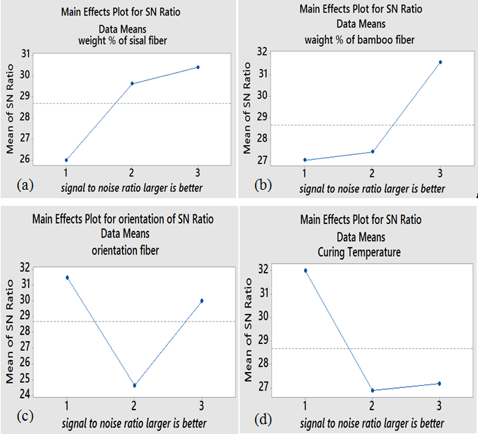 the composite were designed according to Taguchi L4 orthogonal arrays depending on three factors (orientation of plies, matrix/hardness ratio and curing time) with two levels and fabricated with hand layup technique. The analyzed SN ratio display that the hybrid (bamboo- banana-chopped strand glass) fibers reinforced epoxy composites designed with plies orientation [0G, 0BM, +45BN, 0G], epoxy to hardness ratio (10:1) and 30 minutes curing time gave the better hardness values.5 Generally, this work concludes that the appropriate hardness of composite material is found by properly design the orientation of fibers and matrix to hardener mixing ratios.