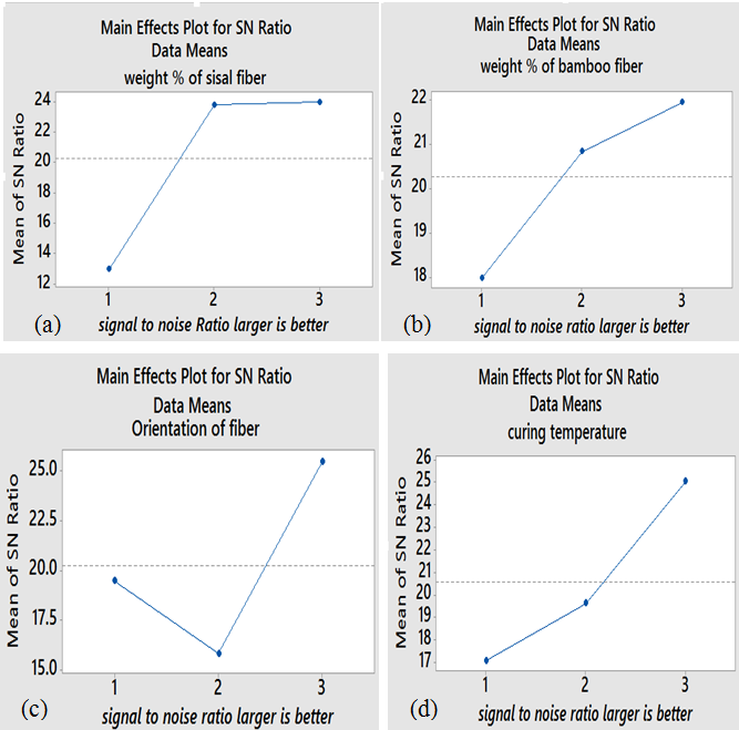 The S/N ratio values for each experiment are computed by using the MINITAB version 18.0 software. The computed S/N ratio from MINITAB software is presented in Table 4 & Table 5. From Figure 7A & 7B, it is seen that a large SN ratio was recorded for sisal and bamboo fibers of volume fraction at level 3 (15% and15%) respectively. and also from Figure 7C & 7D observed that the large SN ratio was seen for fiber orientation and curing temperature at level 1[0S/0B/0S/0B/0S/0B] and level 1(25ºC) respectively. Generally to increase the compression strength of hybrid sisal/bamboo fiber reinforced epoxy composite under a compression load, fabricate hybrid sisal/bamboo with fiber volume fraction (15%/15%), sisal/bamboo fiber orientation [0S/0B/0S/0B/0S/0B] and curing at 25ºC room temperature is the best one. Figure 8A & 8B, explain that large SN ratio was recorded for sisal and bamboo fibers of volume fraction at level 3(15% and15%) respectively. and also the Figure 8C & 8D, we observe that the large SN ratio was seen for fiber orientation and curing temperature at level 3[0S/90B/90S/0B/0S/90B] and level 3(55ºC) respectively. From this result, the hardness strength increase due to the sisal and bamboo fiber weight decrease from 25% to 15% and due to increasing temperature from 25ºC to 55ºC. And also bi-unidirectional fiber orientation increase hardness strength.