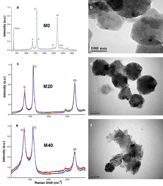 In Figure 2 the Raman spectra and TEM micrographs of "pompon" graphenes are presented. For all samples, D, G and 2D bands of the sp2 phase of carbon (disordered graphene or nanographite) are recorded at ~1350, ~1580 and ~2700 cm-1.