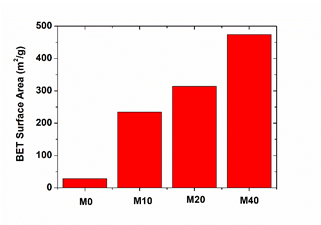 The results are obtained correlate well with the change in the specific surface area of graphene using the BET method. In Figure 3 the histogram of changes of these values for various graphene modifications is presented. Thus, for M0, M10, M20 and M40 samples the surface area values are 28.23 m2∙g-1, 233.9 m2∙g-1, 314.5 m2∙g-1, 474 m2∙g-1, accordingly.