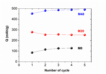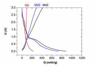 Taking into account the fact that a larger number of individual graphene leaves are observed during machining for 40 minutes, and this modification has the largest specific surface area, we assumed that M40 graphene-based electrodes would be more "accessible" for the introduction of lithium ions and have higher electrochemical parameters.