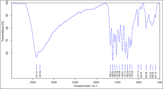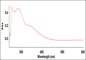 The electronic spectrum of a complex was recorded in a 10-4 M DMSO solution. The high-intensity spectral peak in the complex UV region at 251 and 287 nm are due to intra-ligand transition.13 The low-intensity peak at 382 nm is assigned ligand to metal charge transfer transition. The respective spectrum has been shown in Figure 3.