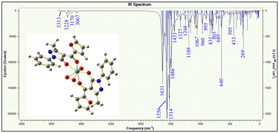The essential experimental [theoretical] spectral bands and their tentative assignments of a title complex are discussed. The complex displays a strong band at 940 [960] cm-1 assigned to the v(Mo=O) mode. The metal peroxo grouping gives rise to three IR active vibrational modes, and these are (O-O) stretching (v1), symmetric (Mo-O) stretching (v2), and asymmetric (Mo-O) stretching (v3). The characteristic (v1) (O-O) mode of the complex appears at 820 [831] cm-1, while the (v2) and (v3) modes appear at 680 [640]cm-1 and 754[803]cm-1, respectively. These observations agree with results reported elsewhere.11,12 The experimental and theoretical FTIR spectrum are given in Figures 1 & 2, respectively.