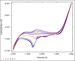 The electrochemistry of the studied complex was monitored by cyclic voltammograms in DMSO with tetrabutylammonium perchlorate (TBAP) as a supporting electrolyte in the potential range ± 2000 mV versus current. It shows spectral and structural changes associated with electron transfer. The typical voltammograms are shown in Figure 4. The complex shows an irreversible redox wave as one-step electron reduction Mo(VI)-Mo(V) and oxidation waves as one-electron oxidation Mo(V)-Mo(VI). In these cases, the difference in peak potentials increases as the scan rate increases. The constancy of Er shows that in all cases both peaks are complementary to each other. The peak current ratio Ipa/Ipc is less than one, indicating that the electron transfer reaction is followed by a chemical reaction EC mechanism.14