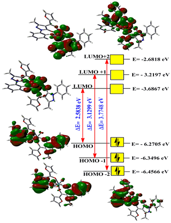The frontier molecular orbitals, i.e., the HOMOs and LUMOs, are crucial parameters for chemical reactions.16 They can be used to determine the mode of interaction between molecules and other species. Therefore, they are also referred to as boundary orbitals. The HOMOs act primarily as electron donors, while the LUMOs act primarily as electron acceptors. The gap between HOMO and LUMO characterizes molecular chemical stability.17 Here we have selected three pairs of six applicable molecular orbitals, namely the third highest [HOMO -2], the second highest [HOMO -1] and the highest occupied MO's [HOMO], the lowest [LUMO], the second lowest [LUMO+1] and the third lowest unoccupied MO's [LUMO+2] worked out for [MoO(O2)(fmphp)2]. The observed energies in order are -6.457, -6.350, -6.270, -3.687, -3.220, and-2.682 eV, while the energy gap between [HOMO-LUMO], [HOMO -1-LUMO+1], and [HOMO -2-LUMO+2] is 2.584, 3.130, and 3.775 eV, respectively. The electronic filling scheme of FMOs for the complex molecule confirms that it is diamagnetic due to the paired electrons in HOMO. The chemistry of the softness and hardness of the molecule is based on the FMOs, the hard molecules have a higher value of the HOMO-LUMO gap and the soft molecules have a smaller value of the HOMO-LUMO gap.18 The LUMO is mainly localized at the donor and acceptor atoms around the metal. In comparison, HOMO is delocalized over the pyrazoline moiety. The HOMO-LUMO structures with an energy level audio diagram of the complex are shown in Figure 6. Another important property related to the dipole moment and hardness is the electrophilicity index (w) and global softness (S), as indicated below. The values of w and S are listed in Table 2.