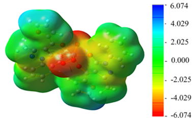 The MESP topology is used to understand the reactive actions, as negative regions can be considered nucleophilic centers. MESP-based characterization of a molecule in terms of electron-rich and electron-poor regions provides a meaningful prediction of its interaction with other molecules. In contrast, the positive regions are potential electrophilic centers. The surface of the molecular electrostatic potential19 is shown in Figure 7. It shows the molecular shape, size, and electrostatic potential values of the molybdenum(VI) complex. The MESP map of the studied compound shows that the carbonyl oxygen and hydroxyl oxygen atoms represent the most negative potential region. In contrast, the seven oxygen donor atoms are bound with the molybdenum center in the most negative region due to their nucleophilic tendency. The hydrogen atoms in the compound carry the region of maximum positive charge. The majority of the green regions in the MESP surfaces correspond to a potential halfway between the two extremes of the red and blue colors.