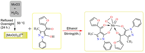 The oxo-peroxo-molybdenum (VI) compound containing 4-furoyl-3-methyl-1-phenyl-pyrazoline-5-one understudy was constructed according to the following Scheme 1.