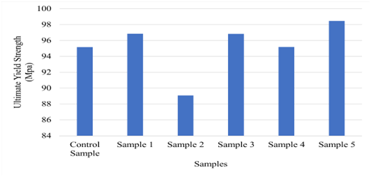 Tensile tests were performed on the developed hybrid composites with the specifications of ASTM 8M-91 standard. The samples for the test were machined to round specimen configuration with 6mm diameter and 30mm gauge length. The test was carried out at room temperature using an Instron universal testing machine operated at a strain rate of 10m/s. Three repeats tests were performed and average value was taken to guarantee reliability of the generated data. The tensile properties evaluated were from the stress-strain curves. The properties are ultimate tensile strength (σu), 0.2 % offset yield strength (σy), and strain to fracture (ɛf).