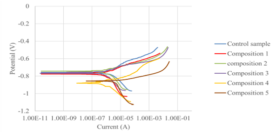 Table 3 shows the corrosion potentials and corrosion current densities of the Aluminum 6063, single reinforced composites (Al/SiC and Al/PBSA) and Aluminum hybrid composite (Al/SiC/PBA) while Figure 3 presents the potentiodynamic polarization curves for Aluminum 6063 and the developed composites. Figure 3 also presents the corrosion potential (Ecorr) and corrosion current density (Icorr). From the data, it was observed that the corrosion potentials (Ecorr) of the composites decreased with increase in PBSA content up to 7.5wt. % PBSA (samples 2 - 4) and then increased (10wt. % PBSA). But the corrosion current density (Icorr) increases with increase in PBSA content up to 10wt. % PBSA. This implies that, the stability of the composites appears to increase with PBSA content up to 7.5 wt. % (as informed by the decreasing corrosion potentials to more positive values with the PBSA content), the corrosion rates actually decreased (from kinetics point of view and judging from the decreasing corrosion current density values) with the PBSA addition. Further addition of PBSA from 7.5 to 10wt. % (samples 4 and 5) made the composite more susceptible to corrosion by decreasing the corrosion potential below that of other three composites. It also decreased the corrosion current. This means that both from thermodynamics and kinetics considerations, samples 4 and 5 containing 7.5 and 10 wt. % PBSA are more susceptible to corrosion than other composites produced. It should be noted that although increasing PBSA content from 7.5 to 10wt. % (samples 4 and 5) increased the susceptibility of the composites to corrosion, it was however observed that it passivated higher than the other composites with highest passivity region in Figure 3.8
