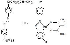 In Figure 1, we provide the general chemical formula of mono-ligand MOMs based on Pd complex alkyl/alkoxy-azobenzene and their parent ligand, where the MOM’s structures are obtained by changing the ligand's terminal R and R’ groups. Specifically, the chemical structures of three MOMs are obtained by incorporating their relevant ligands in Pd complex chemical structures.