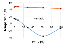 In Figure 3, we present the phase diagram of binary mixtures of mono-ligand Pd-L2 / HL2. Both components exhibit similar TIN transitions, where Pd-L2 shows a wider nematic range (52°C) than HL2 (33°C). Also according to Figure-3, due to complete linear trend of TIN transitions of Pd-L2 / HL2 within the whole composition range of phase diagram confirms total nematic miscibility of their components. In addition, the Pd-L2 / HL2 mixtures also exhibit a distinct eutectic behavior of TCN transitions at around 62%wt Pd-L2 concentration with an expanded nematic range up to 80°C.